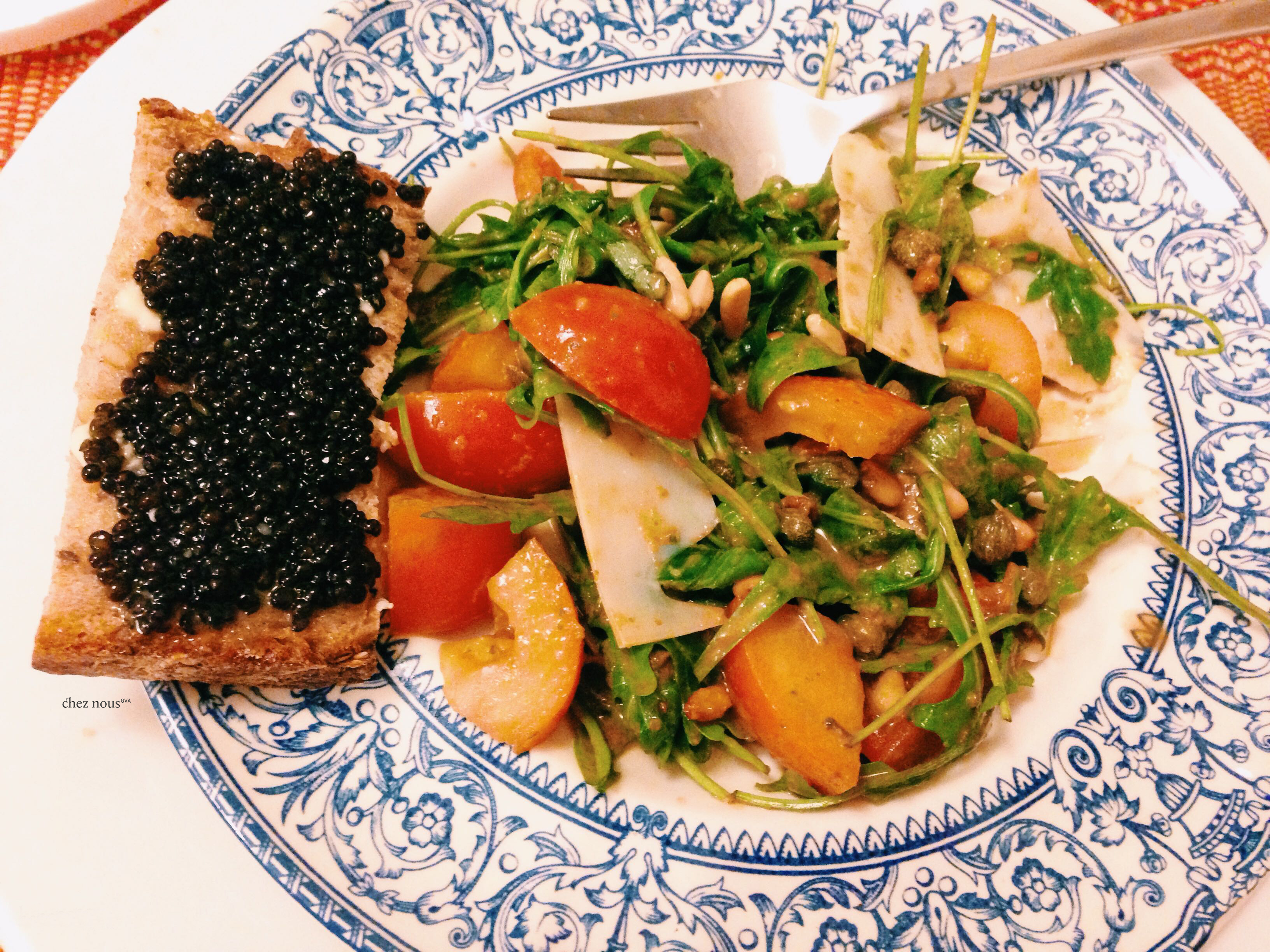 We started the evening with a tomato rucola salad with an anchovy vinaigrette. There was also that indulgent toast with caviar. Great source for Omega-3, the glorified caviar, so relish a bit of those fish eggs from time to time.
