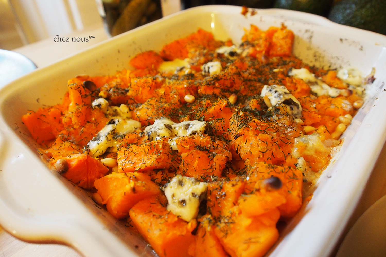 Boil the sweet potato cubes in a pot of salted water. It will take about 10-15 minutes until they are soft. Drain the water. Pour the cooked sweet potatoes in a baking dish. Use a fork to mash the top roughly. Crack some salt and pepper over it, dust with dried or fresh dill, drizzle some olive oil, and sprinkle with pine nuts. Crumble a slice or 2 of your bleu cheese over the dish. Leave to roast in the oven at 200°C for 8-10 minutes or until cheese melts and pine nuts are brown.