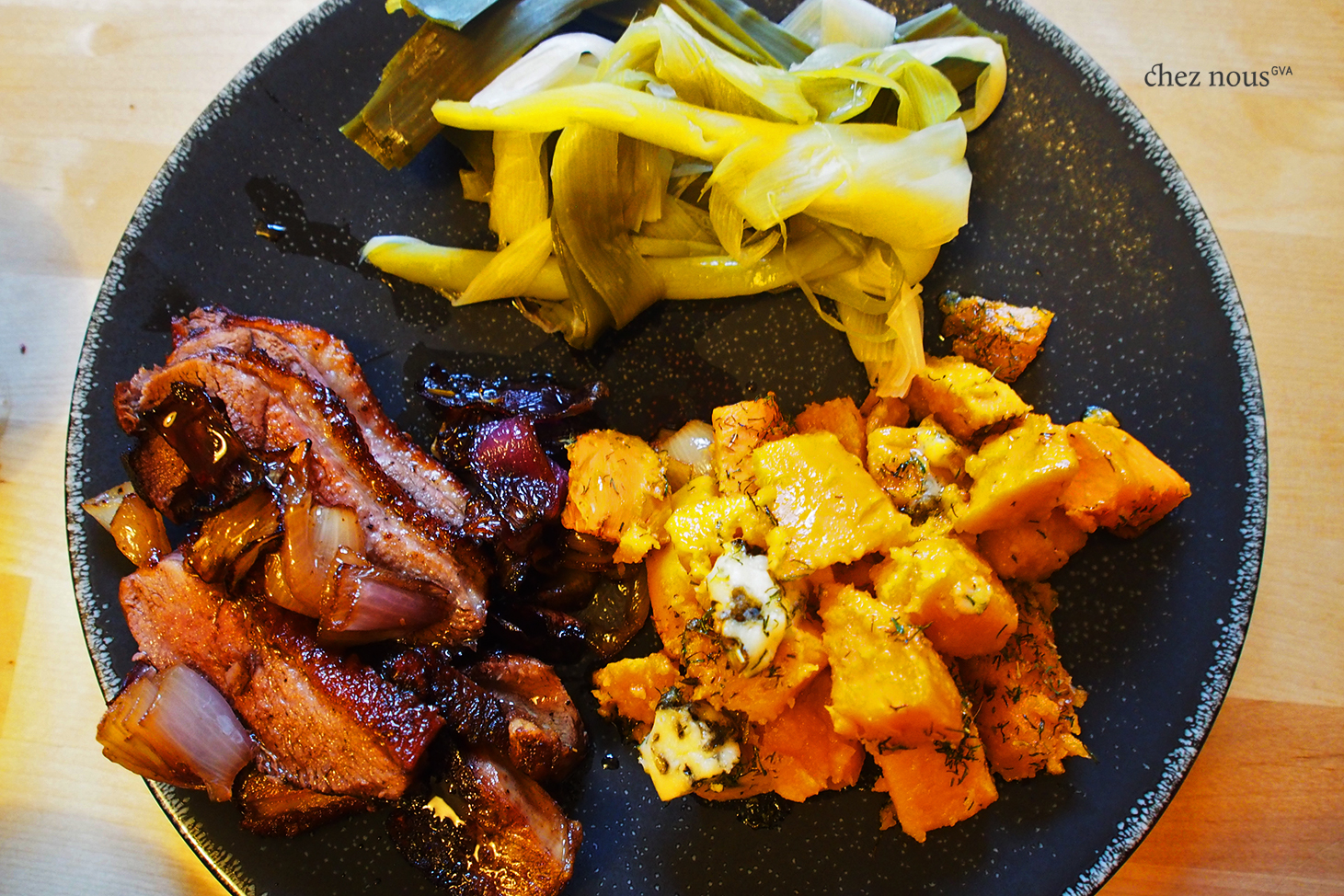 As he did his magic on the duck breast, I made some easy-peasy roasted sweet potato with Roquefort. We love sweet potatoes chez nous. Apart from that sweet mush of a crop, it doesn’t take time to cook them. Boil, fry or roast, it only takes a few minutes, and voila, they’re tender and done.