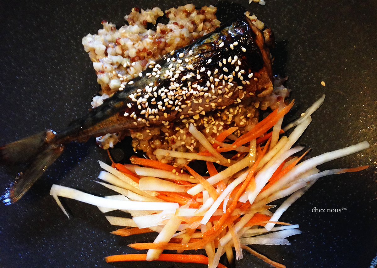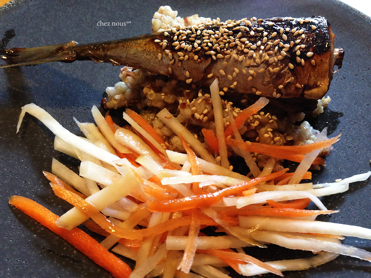 Serve your Mackerel teriyaki over steamed rice, or over a bed of quinoa-boulgour as we did, and a side of pickled carrots/kohlrabi. Dress with the teriyaki sauce and enjoy!